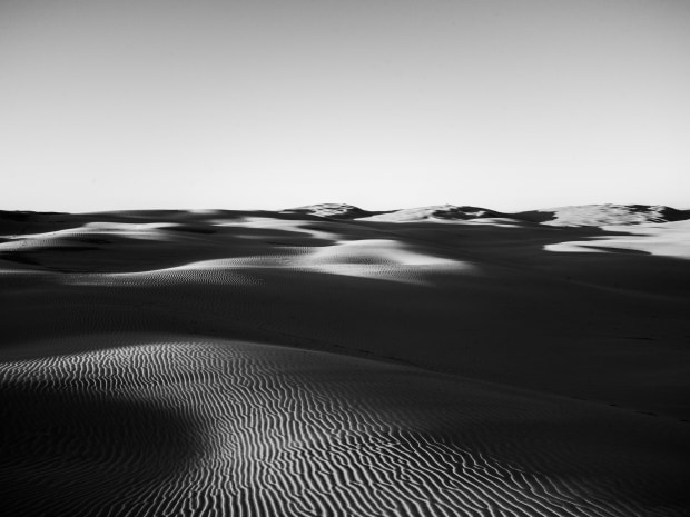 "Textures in Light and Shadow" captures the intricate patterns of desert dunes in monochrome. The interplay of light and shadow emphasises the natural textures, highlighting the delicate, wind-sculpted ridges and undulating forms of the landscape in a striking black-and-white composition.