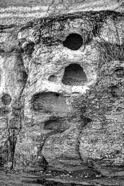 this unusual coastal rock feature is on the South Arm Peninsula in Tasmania. After posting it to social media a local told me that she knew it as the 'angry man rock' and would tell her children to go no further. Finding an angry man rock at a time when the nation is having a difficult and overdue conversation about angry men I decided to share further, and to make more sinister by rendering it to black and white.