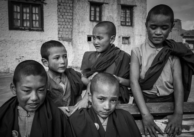 A group of novice monks sit on a bench outside their monastery in Ladakh. Usually the monastery is busy with over 400 monks but most are away in another part of Ladakh listening to teachings by the Dalai Lama. Only a handful of monks remain.