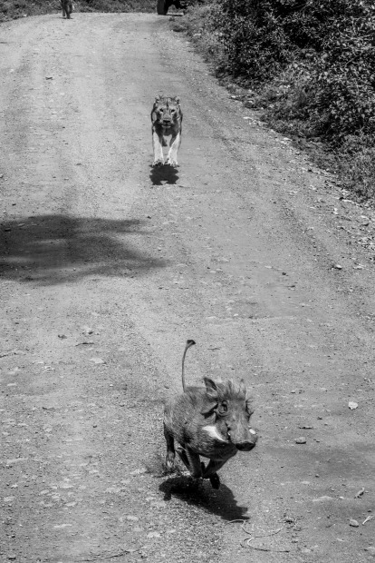 We were in the middle of the action when a lion pride decided to stalk a pair of warthogs on the main road. While the warthogs meandered innocently, three lions, including an adolescent, stalked through the heavy brush at Lake Manyara in Tanzania to pop out and chase the warthogs down the road, While we were happy to photograph the pride of lions being playful on the roadside, we were so privileged to see the chase,. Spoiler, the warthogs escaped. The adolescent underperformed.