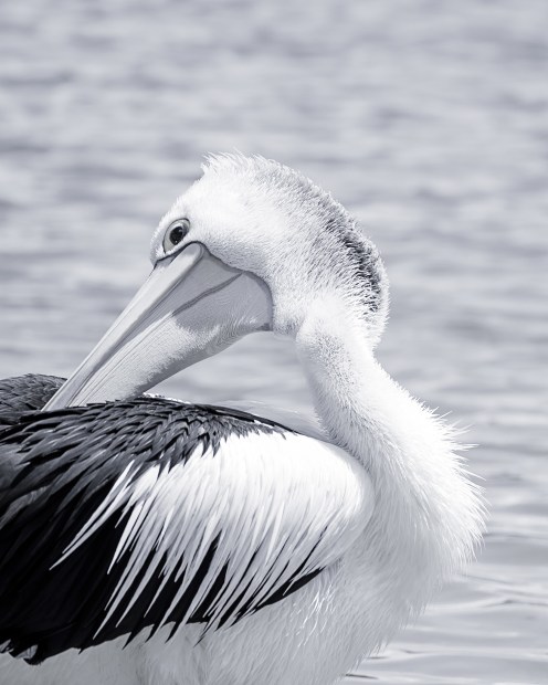This pelican's ability to contort his neck to preen his feathers is something quite beautiful to watch with the light playing on his ever so crisp feathers