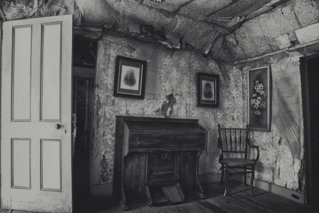 From the earliest days, this Pioneer cottage was home to 9 Sons and 6 daughters. Some had left before the last one was born. The wall paper was laid over top of the previous paper as it became worn and torn. Because of it's age, I thought this room looked so much more suited to being in B/W