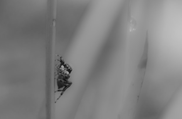 A curious little jumping spider wondering what that large giant thing is doing with the clicky thingy in front of its face.