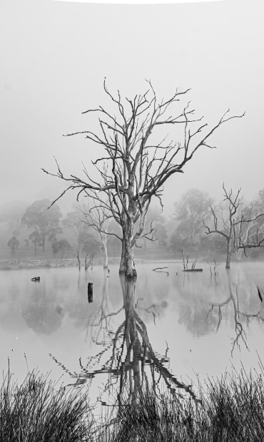 The dead gum tree reaches out of the freezing fog towards the sky at the Big dam, Mulligans flat, ACT.