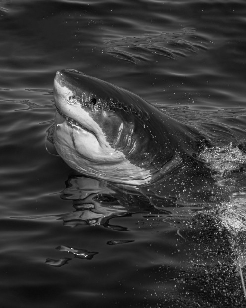 a great white breaches through the water whilst on our shark tour in port lincoln south australia