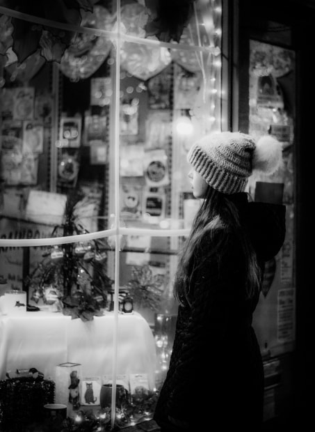 Child gazing into the lolly shop window in a small American town at Christmas time.