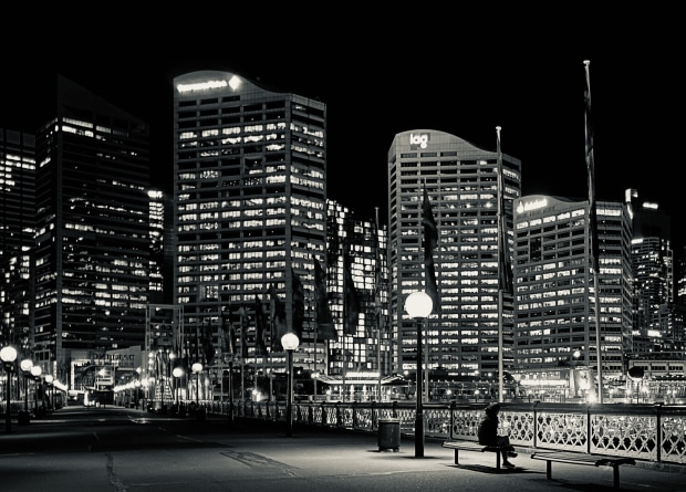 Alone on the bridge, a solitary figure waits patiently for a city to reawaken and for lockdown to end.