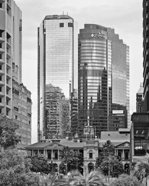 the grand old Brisbane GPO sits below two modern high rise’s with the tropical foliage of Post Office Square in the foreground