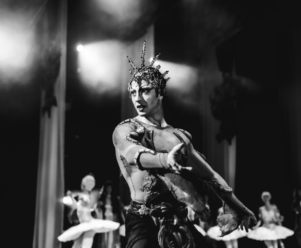 West Australian Ballet Dancer and Colleague ( Ludovico) on Stage performing the role of Carabose fairy in Sleeping Beauty. In the middle of the scene the evil fairy runs through the party and creates a spell over baby Aurora. This image is taken as the performer prepares the spell.