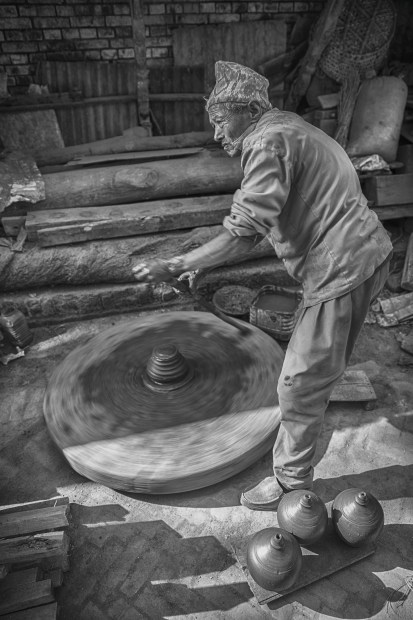 A man in Potari Square, Bhaktapur, Nepal, expertly crafts pots on an antiquated pottery wheel.