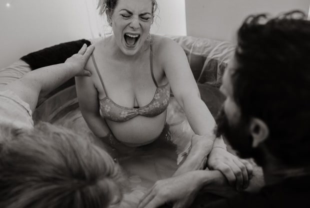 Woman birthing her child , her last push and calling in her feminine power