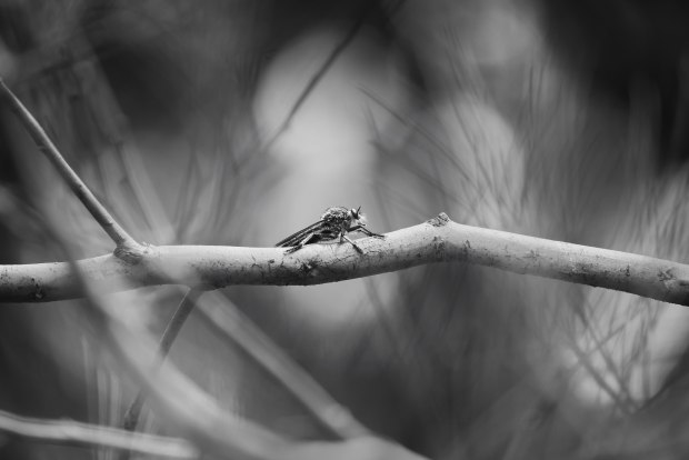 Taken from afar, the robber fly sits quietly on the branch.