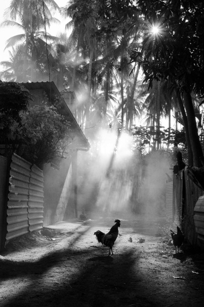 A rooster crows in La Libertad, El Salvador, where poverty and luxury stand side by side. Smoke rises from burning trash - the only waste management locals have. Despite the area's tourist appeal, residents still struggle with limited clean drinking water.