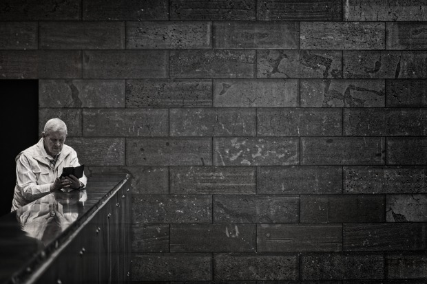 On the edge of a world of stone and shadow, a solitary figure leans into stillness. There's a quietness here as the background fades into weathered greys—textured, worn, timeless. The absence of colour strips away distractions to reveal the solitude of thought.