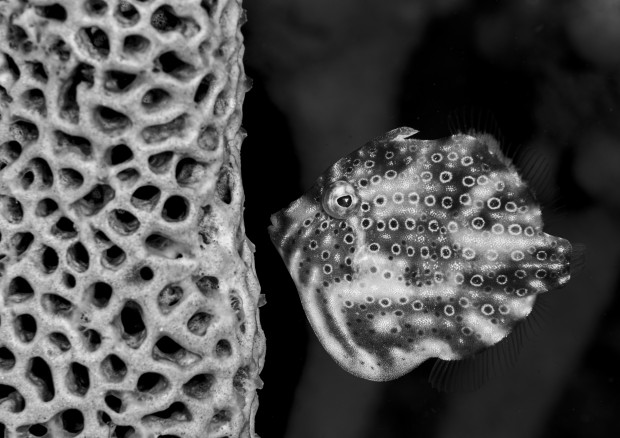 In black and white, the delicate spotted pattern of a pygmy leatherjacket stands out against the textured surface of the honeycomb sponge. The soft, porous details of the sponge create a striking contrast with the leatherjacket’s speckled skin, emphasising the unique interplay of textures and shapes in this underwater scene.