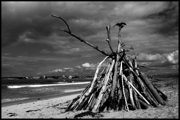 After huge seas an anonymously created driftwood stack near Boat Harbour.
