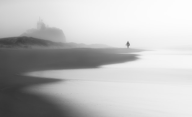 A lone surfer makes his way through thick sea fog - Nobby's Head, NSW