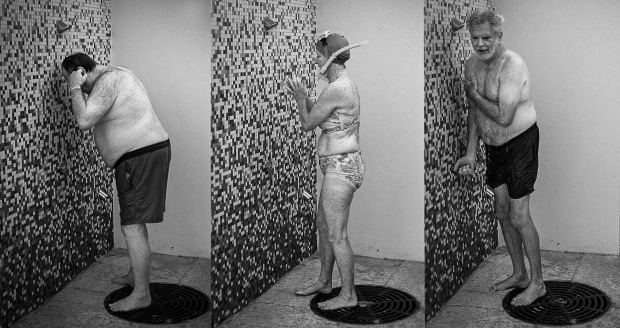 Regular early morning swimmers showering after a refreshing swim in the Indian Ocean.