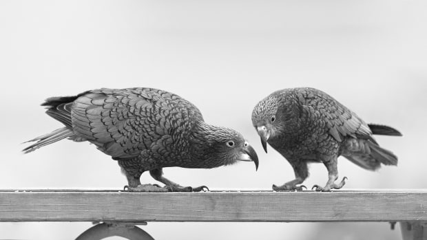 Taken at Okarito, NZ a white caravan gave a perfect background for these two Kea looking or leftovers on a picnic table.