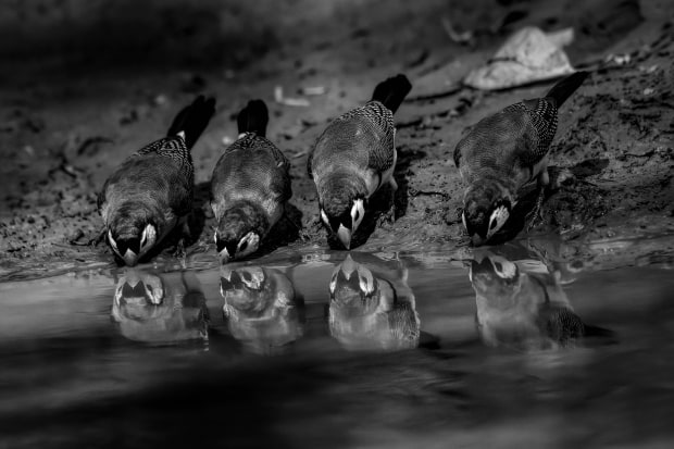 This image was captured in an outback area of Cobar in the middle of an extremely hot summers' day. The puddle was visited by many local birds but these Double-barred Finches caught my imagination due to their beautiful striking plumage and well defined mirror imagery in the muddy paddle.
