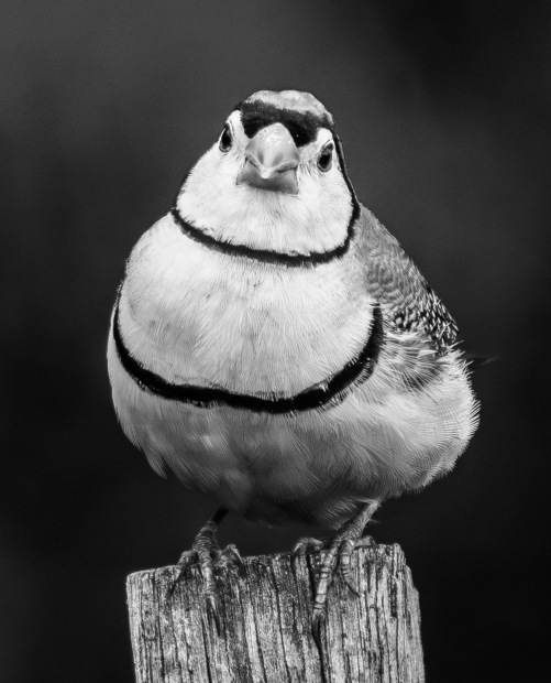 A 'Double barred finch' has a favourite post to sit on in the garden and doesn't like to give it up.
