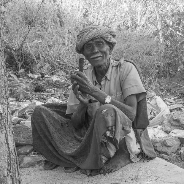 A man quietly sitting on the roadside having a smoke in Rajasthan India