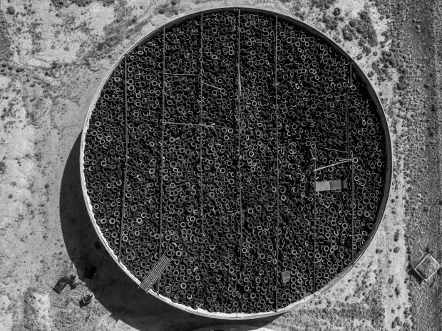 A pile of used tires stored near the South Australian/NSW boarder. There are 5 massive tanks holding hundreds of thousands of tires.