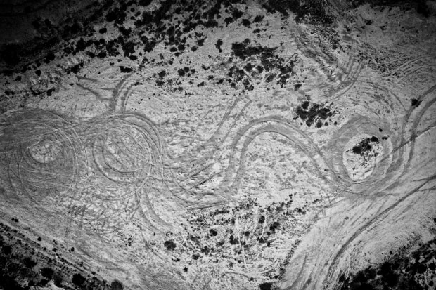 An aerial view of a coastal area reveals concentric circles in the sand not visible at ground level. These vehicle tracks create a kind of abstract artwork.