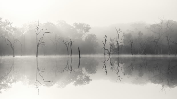 Dead trees in still water on a foggy morning