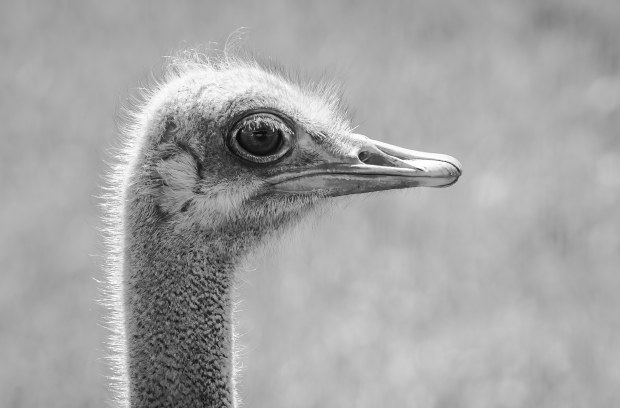 Close up of this Ostrich highlights the tufts of feathers on his head that are highlighted with the backlight provided by the midday sun. Such a stunning bird