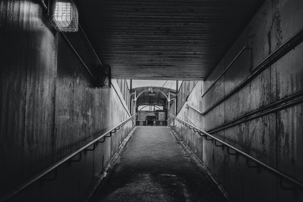 In this image, I attempted to convey the sense of unease on entering a dark railway station tunnel by the use of a high contrast, monochromatic effect.