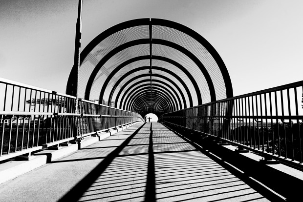 I took this photo whilst on a family walk during the Covid19 pandemic. I love geometry and patterns so was excited to capture this pedestrian bridge in the full sun. I like how a shadow draws a line to the focal point -the light at the end of the tunnel where you can see my family waiting for me.