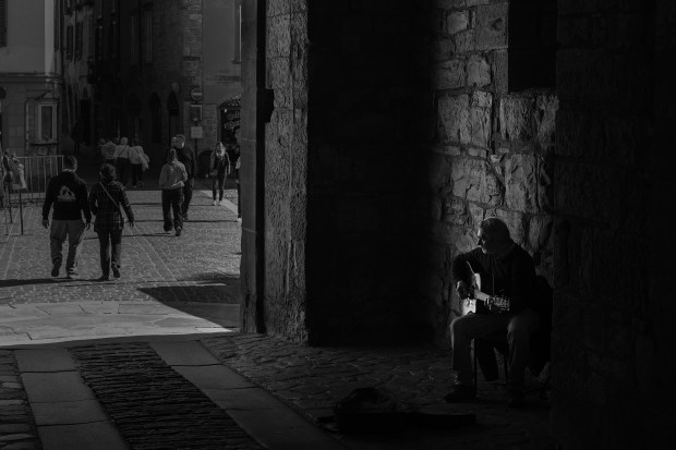 This image was captured in Bergamo, Italy. The light shining perfectly on the busker as the rest of the world went by ignore the man trying to make extra money.