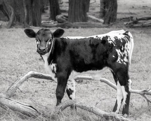Twins were prevalent in 2024 calving season in the south west of WA. One of our cows produced twins where one was a copy of dad who was a black Angus, and the other, twin Number 2, was a carbon copy of mum. His colouring lent itself to a mono photo where the contrast is so obvious.