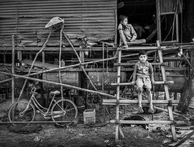 Two brothers sit on the steps of their home in the floating village of Kampong Phluk, Seam Reap. During the dry season the waters recede and the stilts of the houses are exposed.