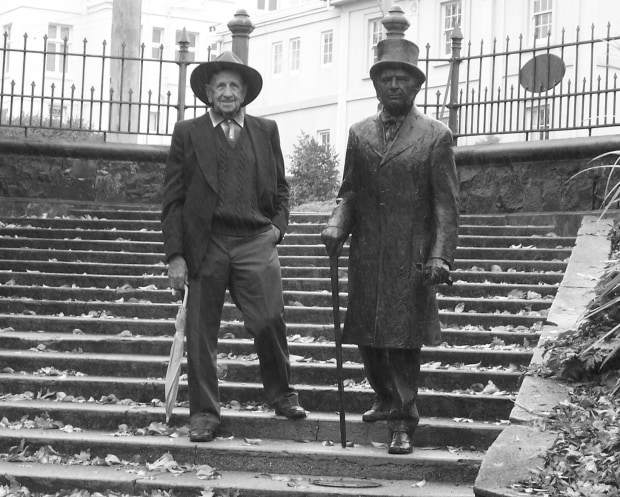 Photo of statue of Dr Pugh in Princess Square Park, Launceston, Tasmania, Australia with posed gentleman on a drizzly day.