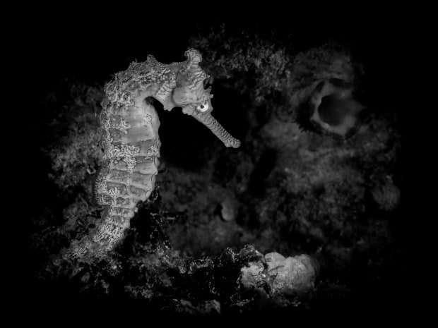 Bright Sea Horse on dark coral background. in black and white
