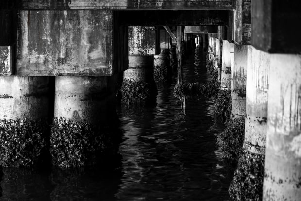 Taken with a 2 second shutter, lying on the lower level to view underneath the higher pier, the variety of textures was alluring