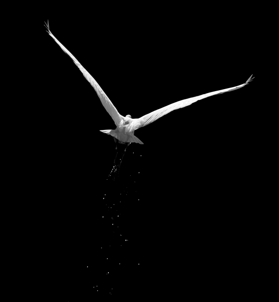 Back view of an egret flying away with sparkling water droplets falling from him.
