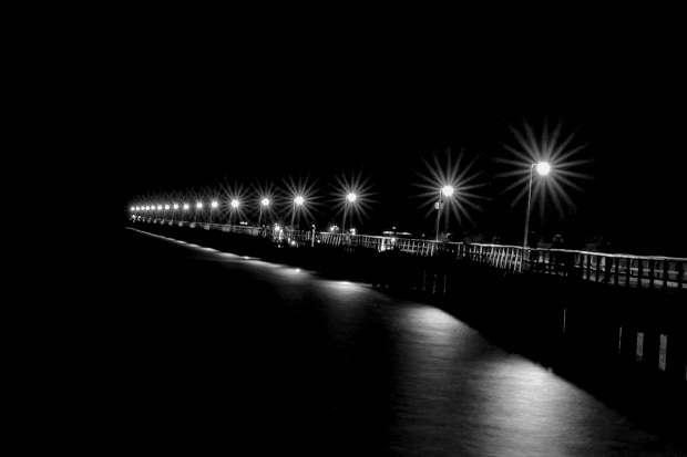A long night exposure of a well used Pier. A majestic structure piercing into mother nature, being enveloped by mans invention of light.