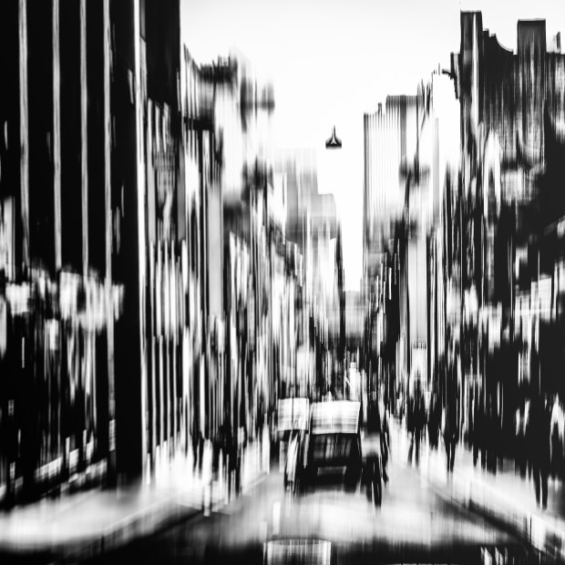 Blurred figures of pedestrians and vehicles weave through the monochrome cityscape, creating a sense of motion and urgency. The towering buildings fade into a haze, amplifying the contrast between light and shadow in the restless urban flow