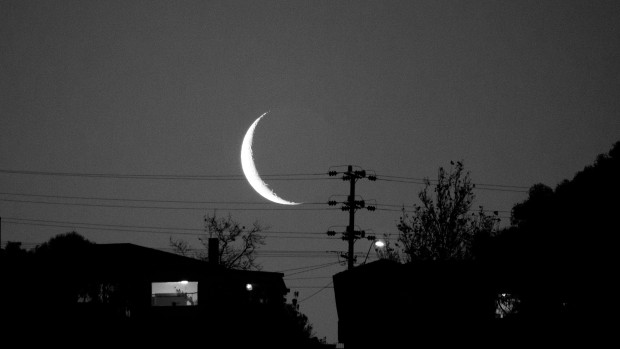 The moon keeps watch over the houses at night.