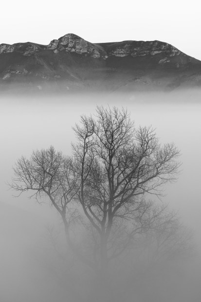 A lone tree stands like a sentinel in the mist as dawn breaks over the beautiful Tuki Tuki Valley, Hawkes Bay, New Zealand.