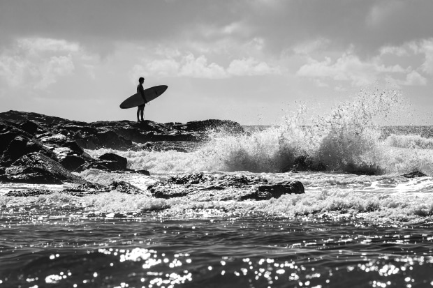 Perched at the edge of the rocks, the surfer studies the horizon, reading the rhythm of the swell. In this moment of stillness before the drop, timing is everything.