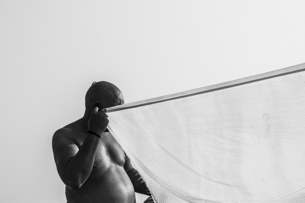 A devotee drying his cloth after bathing in the Ganges River