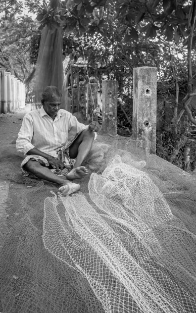 Traditional fisherman mending nets on Vypeen Island, just off Fort Kochi, Kerala, India