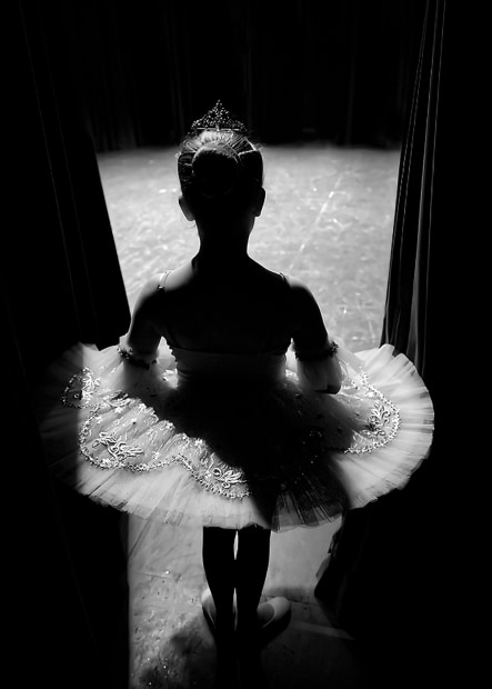 A tiny ballerina standing in the dark wings side stage waiting for her turn to perfom on the big stage.