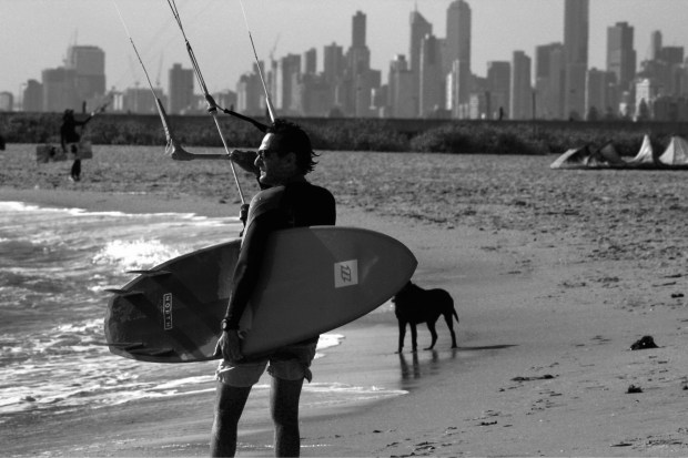 Waiting for the Wind. A parasail rider on an inner city beach waiting for the breeze.