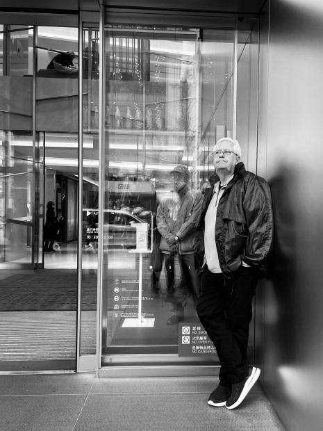 Photo of a tourist outside a building in Toyko, waiting for the rain to stop. While the man is still life goes on around him, you can see people inside the building , people in the street with their umbrellas up and the display mannequins of Uniqlo moving on their conveyor belt.