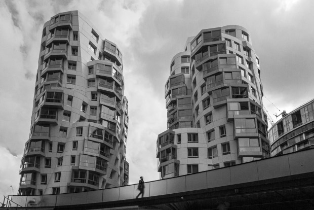 Outside the redevelopment of Battersea Power Station in London, there are a lot of new apartments. I liked the irregular pattern of these Frank Gehry designed apartments and just had to wait for a person to walk past, to complete the story.